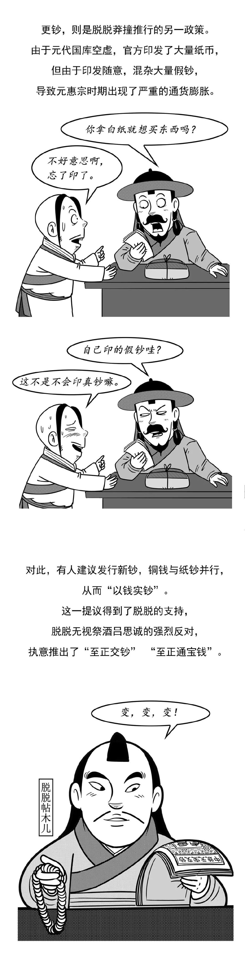 为了解决这些问题,脱脱有了更钞的想法,对此左司都事武祺建言:“民间流转者少,致伪钞滋多。”言下之意是说钞法问题源于钞数量太少,这与币值的原理可以说完全相悖。吏部尚书偰哲笃也提出建议,认为应该同时发行交钞与铜钱。