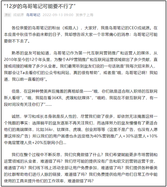 9月13日,知名移动互联网知识分享平台鸟哥笔记创始人CEO戎斌源在公众号发文称:“鸟哥笔记可能要做不下去了”。同时对外透露,在过去12年里,鸟哥笔记“每年平均亏损400万元”。