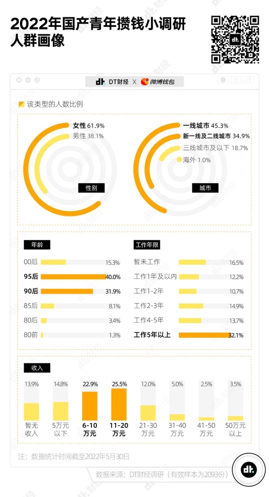 需要说明的是,共有 2093 人参与了本次调研,男女比例约为4:6,一线、新一线城市、二线城市人群占比超过 8 成,95后和00后占比超过一半,工作1到3年的人群占比约 4 成。所以,可以认为这是一份针对大城市职场新生代的洞察。