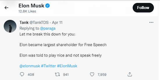 然而在当时,也有人指出了一个关键的问题:如果真如马斯克所说的“被动投资”那样的话,加入董事会已经超过了被动投资的定义。这也是为什么很多观察者都认为,马斯克之前使用“被动投资”的名义,只是为了最大限度避免自己的持股计划,以及后续的“阴谋”,提前被 Twitter 董事会察觉。