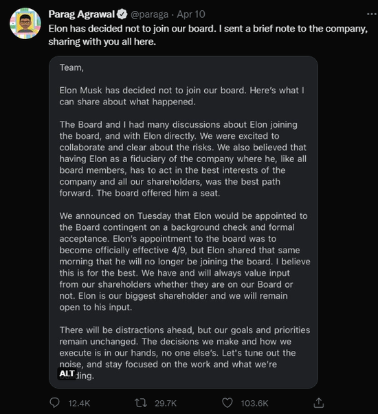 随后,Twitter 突然发布公告,宣布马斯克不想当董事。CEO Agrawal 表示,马斯克的董事任命本来在当天正式生效,然而董事会收到了马斯克的消息,表示不会加入董事会。“我相信这是最好的结果,”Agrawal 写道。