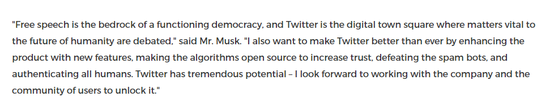 正如马斯克在收购声明中所说的那样,此番收购 Twitter 的最重要目的,就是彻底修改和重写这个平台对于言论管理和发表言论后果的各项规章制度。他在最近各个渠道多次表示过希望保护在这个平台上保护“free speech”。