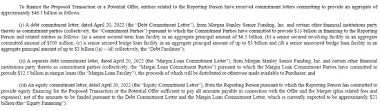 具体来说,马斯克从大摩旗下的 Morgan Stanley Senior Funding 以及其它金融机构获得了普通、周转、过桥、保证金贷款等在内的总计255亿美元贷款承诺,并且自己也承诺出资220亿美元用于收购交易。