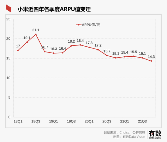 根据年报显示,小米最新一季的ARPU为14.3元,隔壁美团外卖都有40多元的ARPU。而小米的对标对象——苹果,2020第一季度的ARPU超过70元人民币。