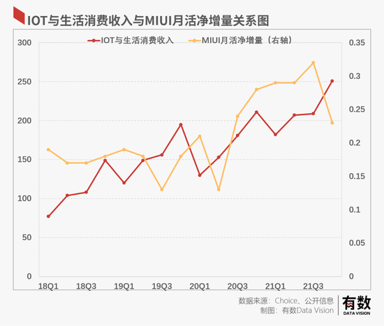 再看小米MIUI的月活净增量,与IOT与生活消费业务收入也没有呈现出明显的关系。