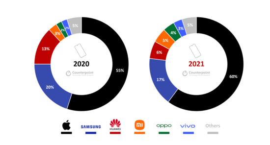 华为确实让出了一块,它的市场份额从2020年的13%下降到了6%,但把握机会的不是小米,而是苹果。小米仅提升了2%,获取的份额与OPPO相当。