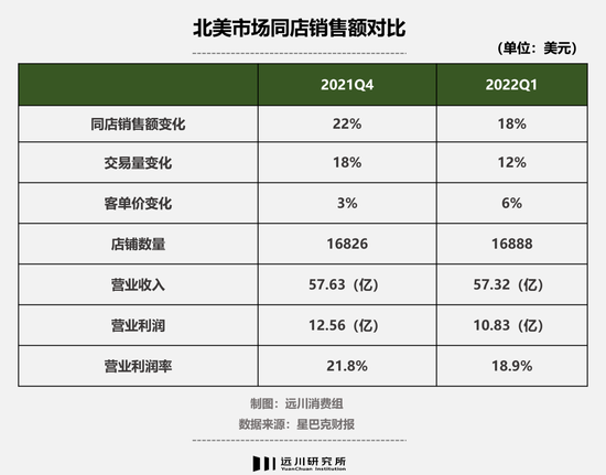 在北美市场,星巴克2022财年Q1的同店销售额同比上涨18%,其中交易量上涨12%,客单价上涨6%,这是两轮调价后的第一个财季。但在调价措施刚起步的上一财季(2021财年Q4),当季星巴克同店销售额的增幅还主要是靠交易量的上涨(18%),而非客单价(3%)。