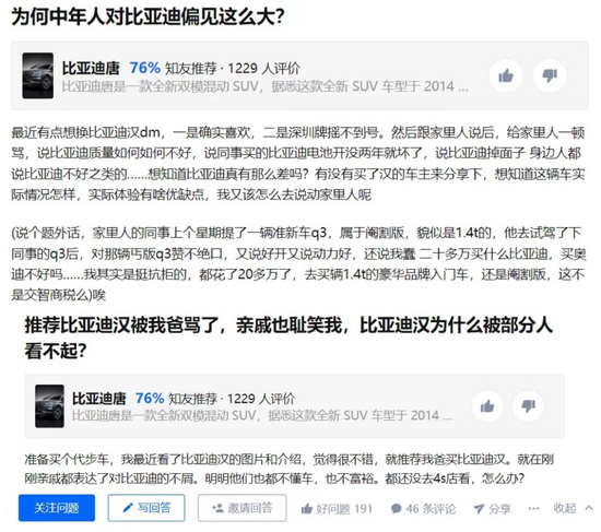 我们在知乎上搜索比亚迪,能看到不少相似问题,在部分车主购买比亚迪时,周围亲戚朋友几乎一致给予了否定的答案。