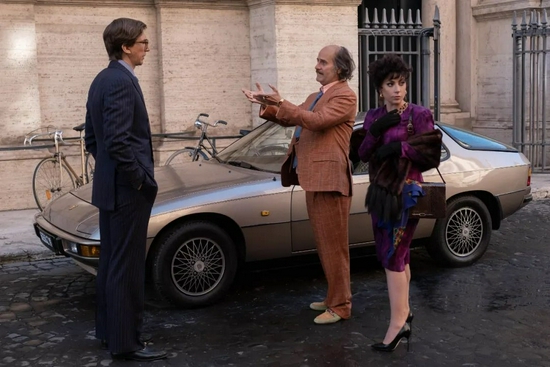 《古驰家族》剧照。片中角色(右起)帕特里齐娅和一对堂兄弟,保罗·古驰和毛里齐奥·古驰