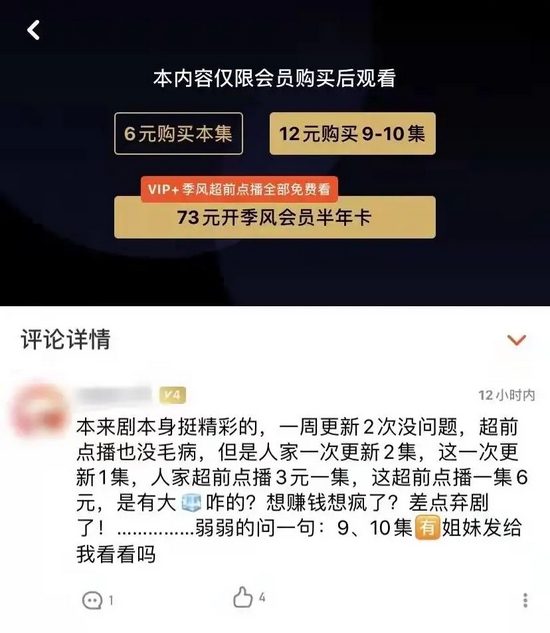 2019年年末《庆余年》播出后,爱奇艺试水超前点播模式,希望通过在会员费的基础上,再收一次点播服务费。这是一条被腾讯视频曾验证过的道路,2019年,腾讯视频的独播剧《陈情令》首次开启超前点播,仅开通超前点播当晚,就有75万人付费,不到一天便有超越250万人充值,片方一天收入近8000万。超前点播的模式在一定上缓解了平台的压力。