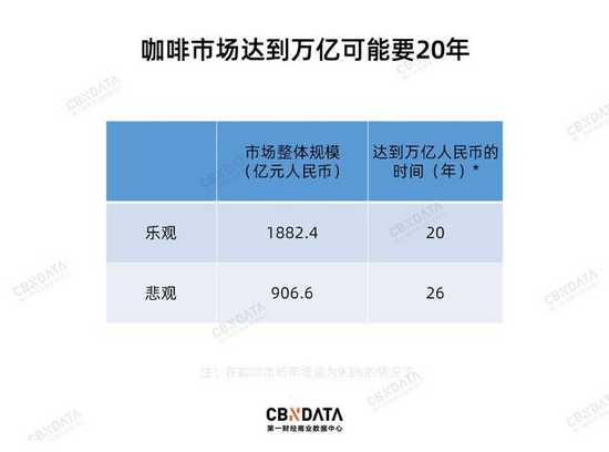 根据星巴克的业绩能推算出一组较乐观的数据,中国咖啡市场的总规模为1882.4亿元人民币,达到万亿人民币规模需要20年。